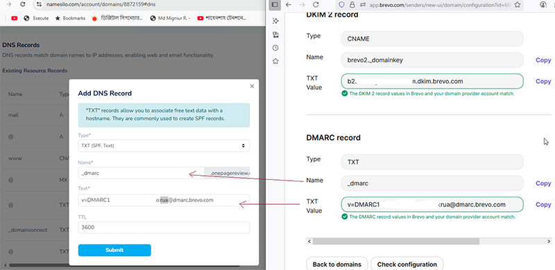 ). Wait 24–48 hours for propagation. - Verify that Brevo added the DKIM (and optionally DMARC) records in NameSilo’s DNS settings. Check with MX Toolbox (